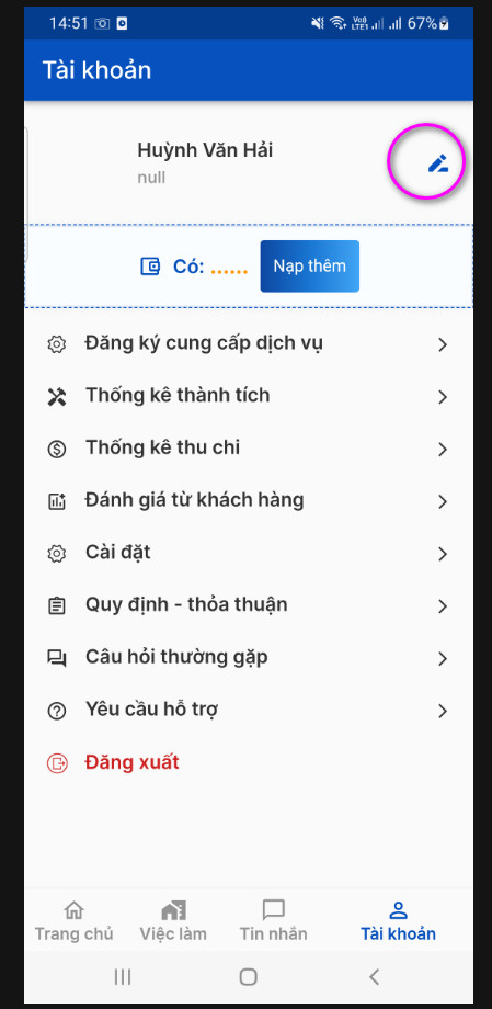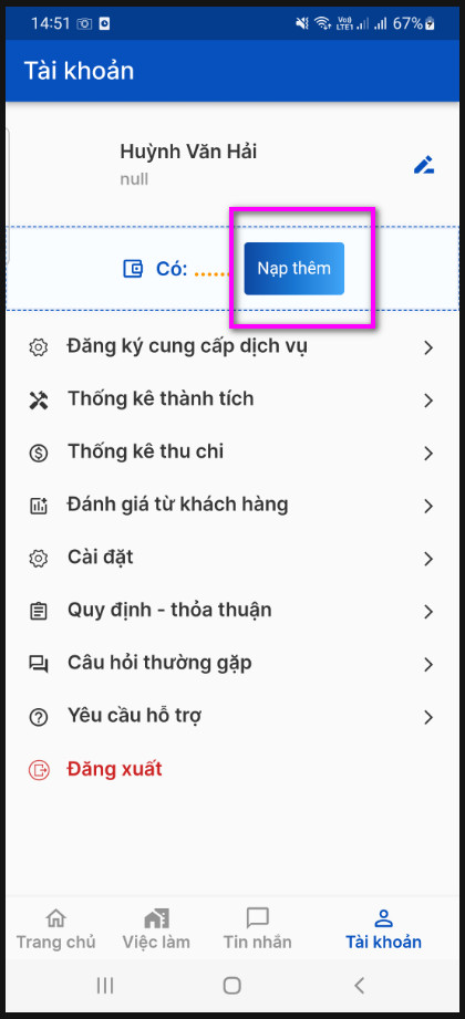 PHẦN 1: NẠP VÍ NHẬN VIỆC (áp dụng cho Thợ/Đơn vị cung ứng lao động)