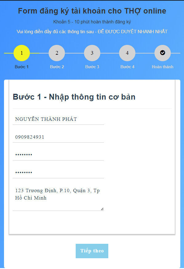 Bước 1: Nhập thông tin cá nhân và tài khoản, bước này Thợ cần nhập Họ Và Tên, số điện thoại di động, mật khẩu và địa chỉ liên hệ