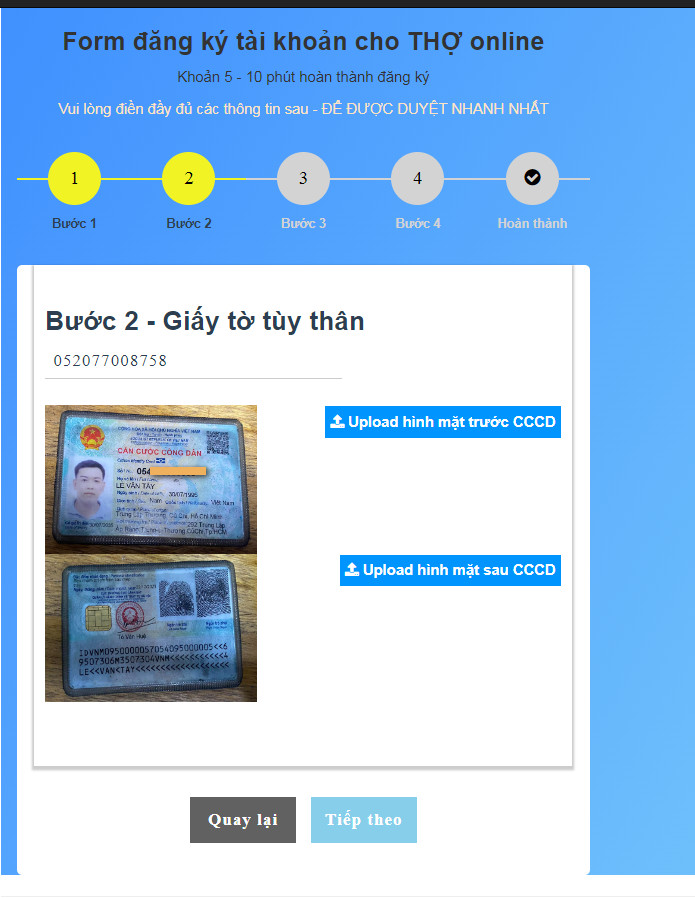 Bước 2: Nhập thông tin giấy tờ tùy thân, Thợ cần nhập số CCCD, đưa hình ảnh mặt trước và mặt sau CCCD lên
