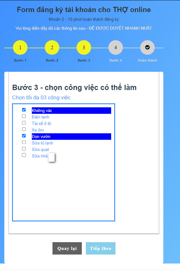Click vào link đăng ký thợ này rồi thực hiện các bước sau
