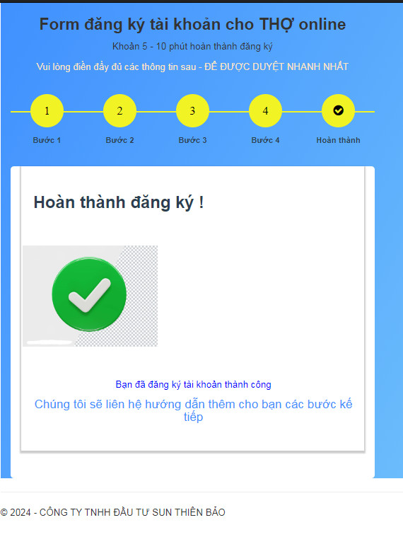 Bước 5: Đã hoàn thành đăng ký, Thợ vui lòng đợi chúng tôi sẽ liên hệ hướng dẫn thêm các bước tiếp theo
